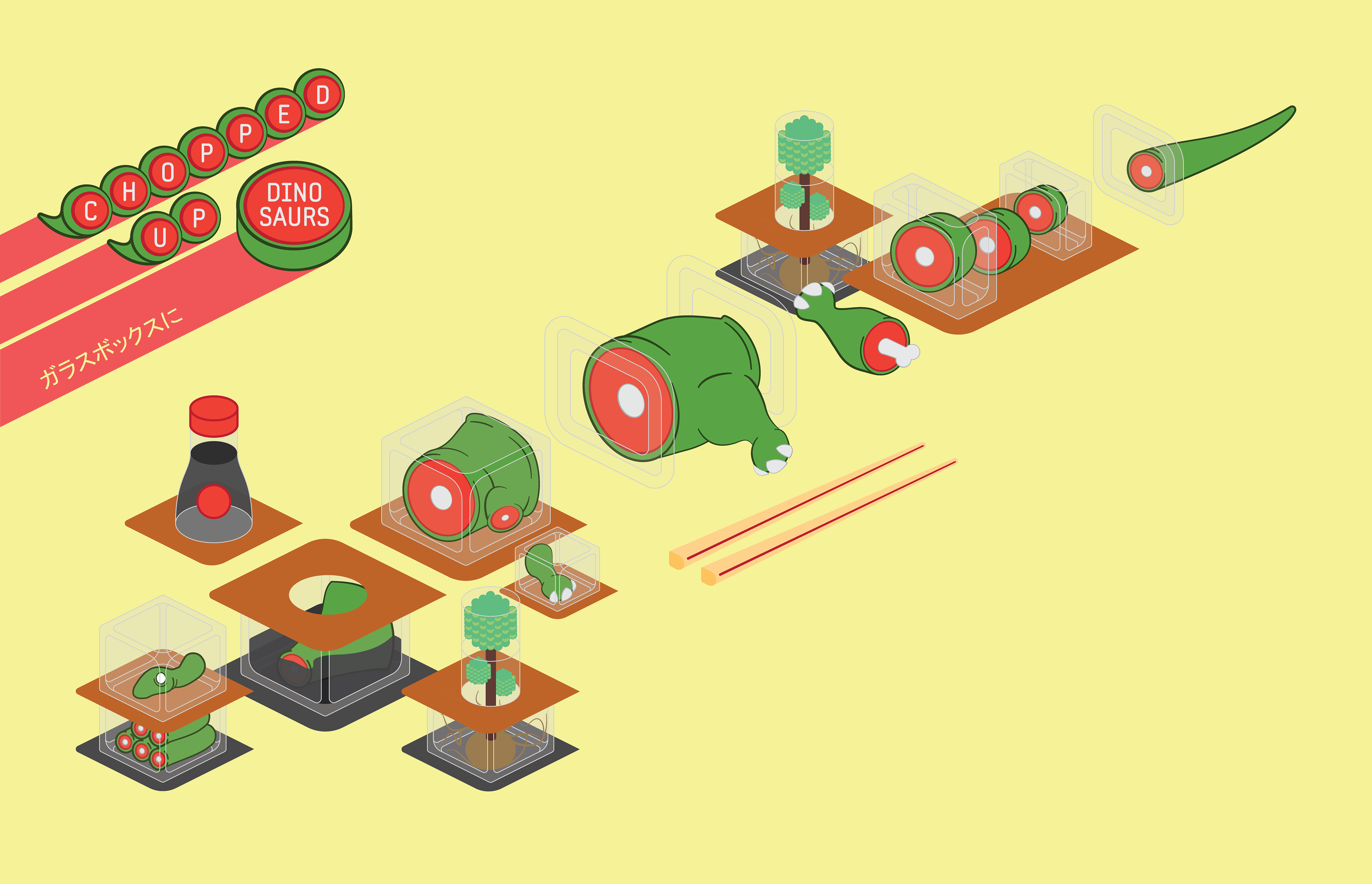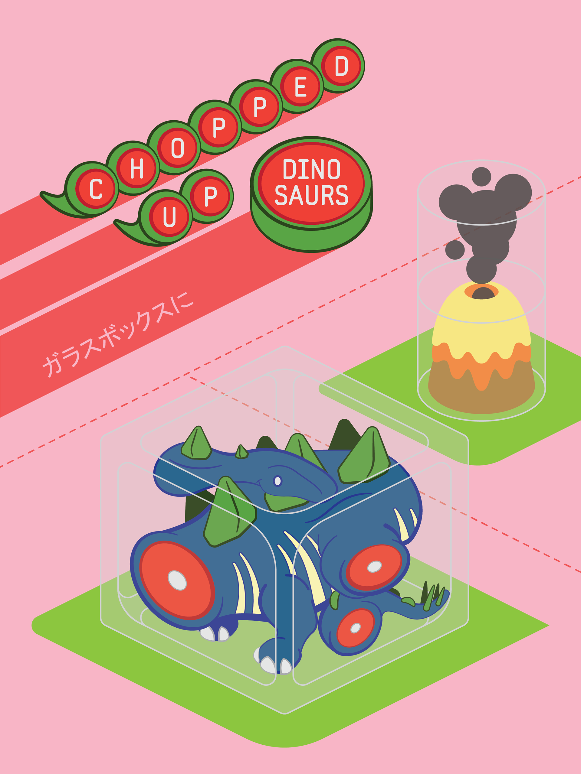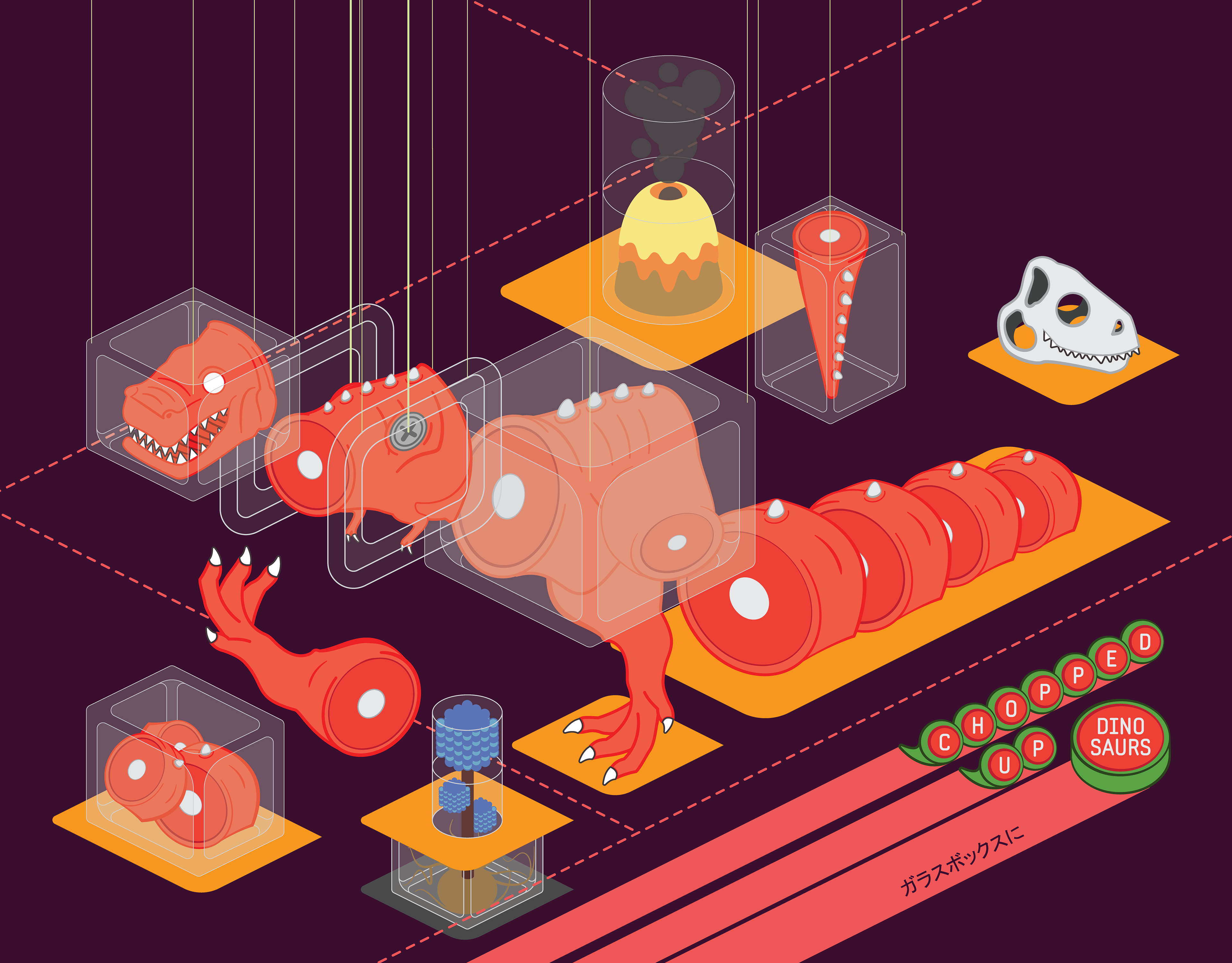 A series of illustrations featuring Chopped Up Dinosaurs in glass boxes.