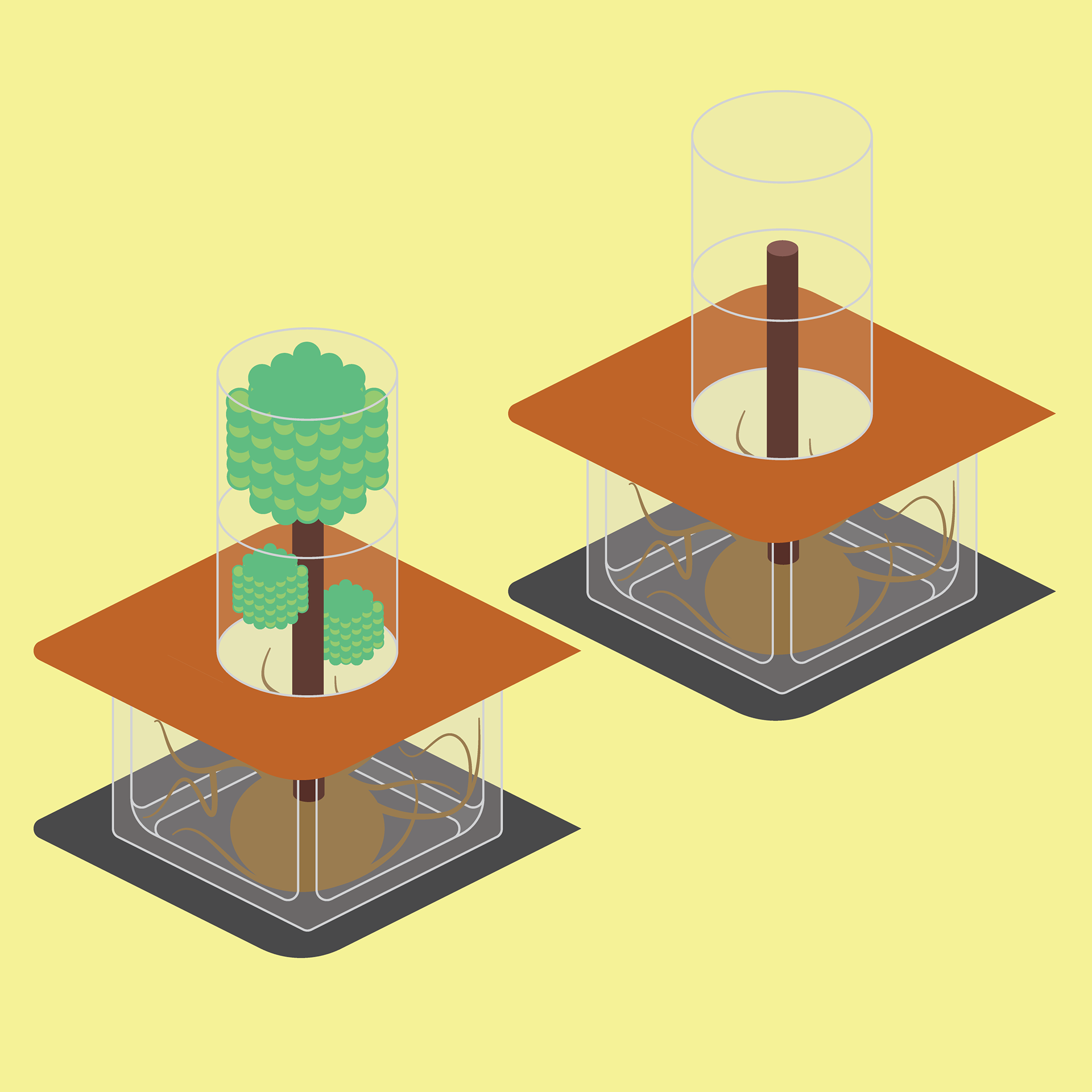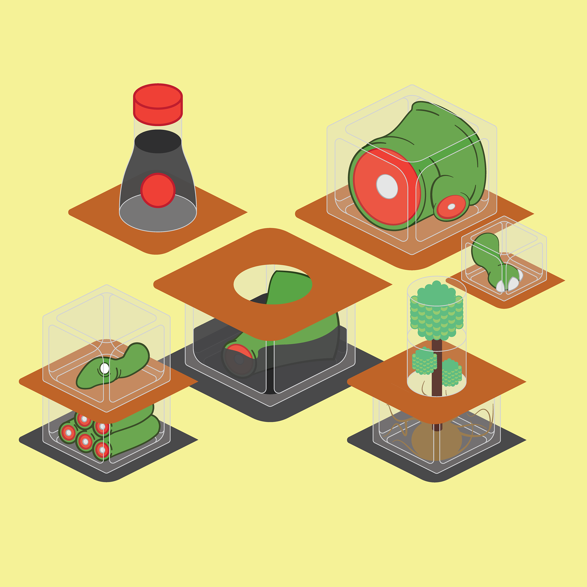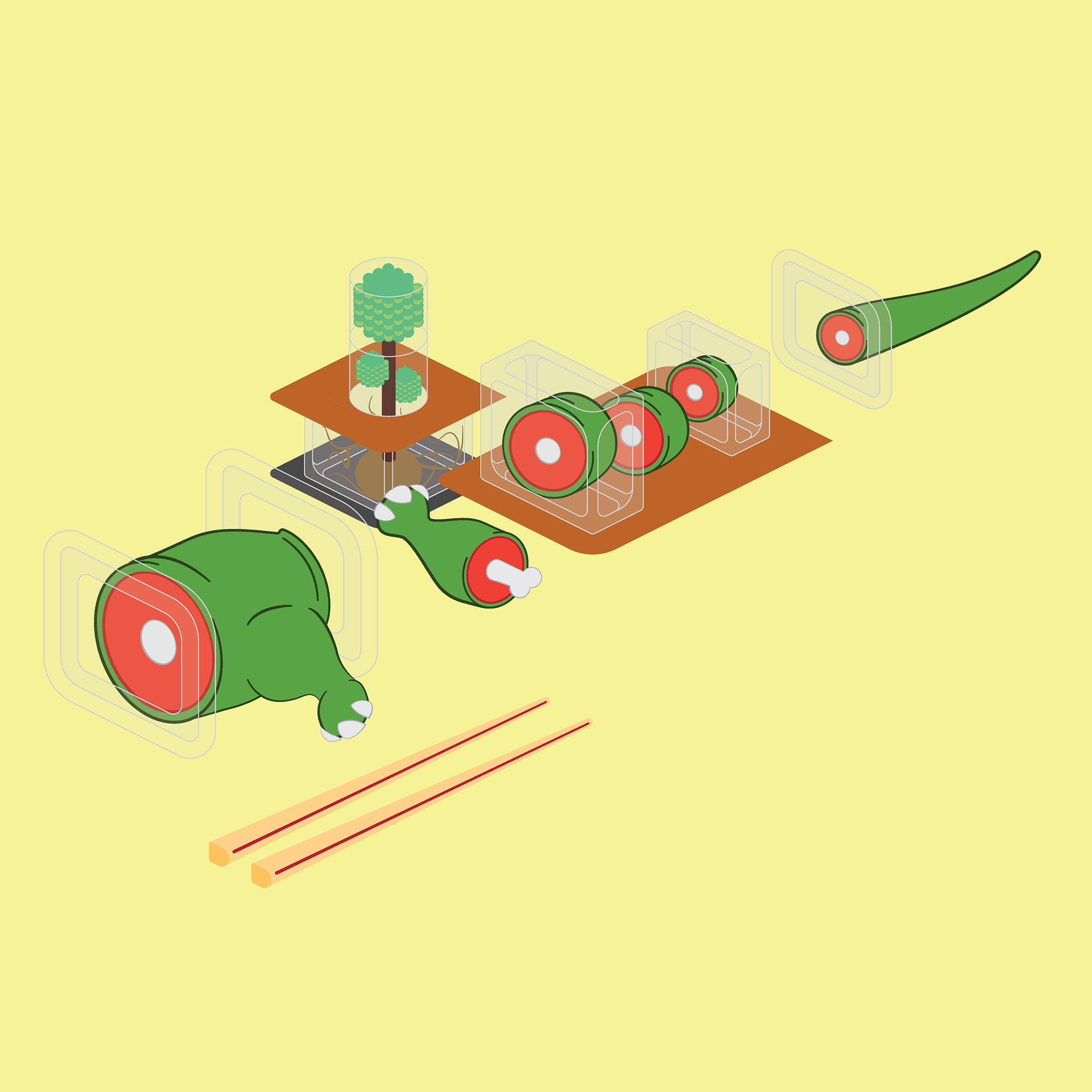 A series of illustrations featuring Chopped Up Dinosaurs in glass boxes.